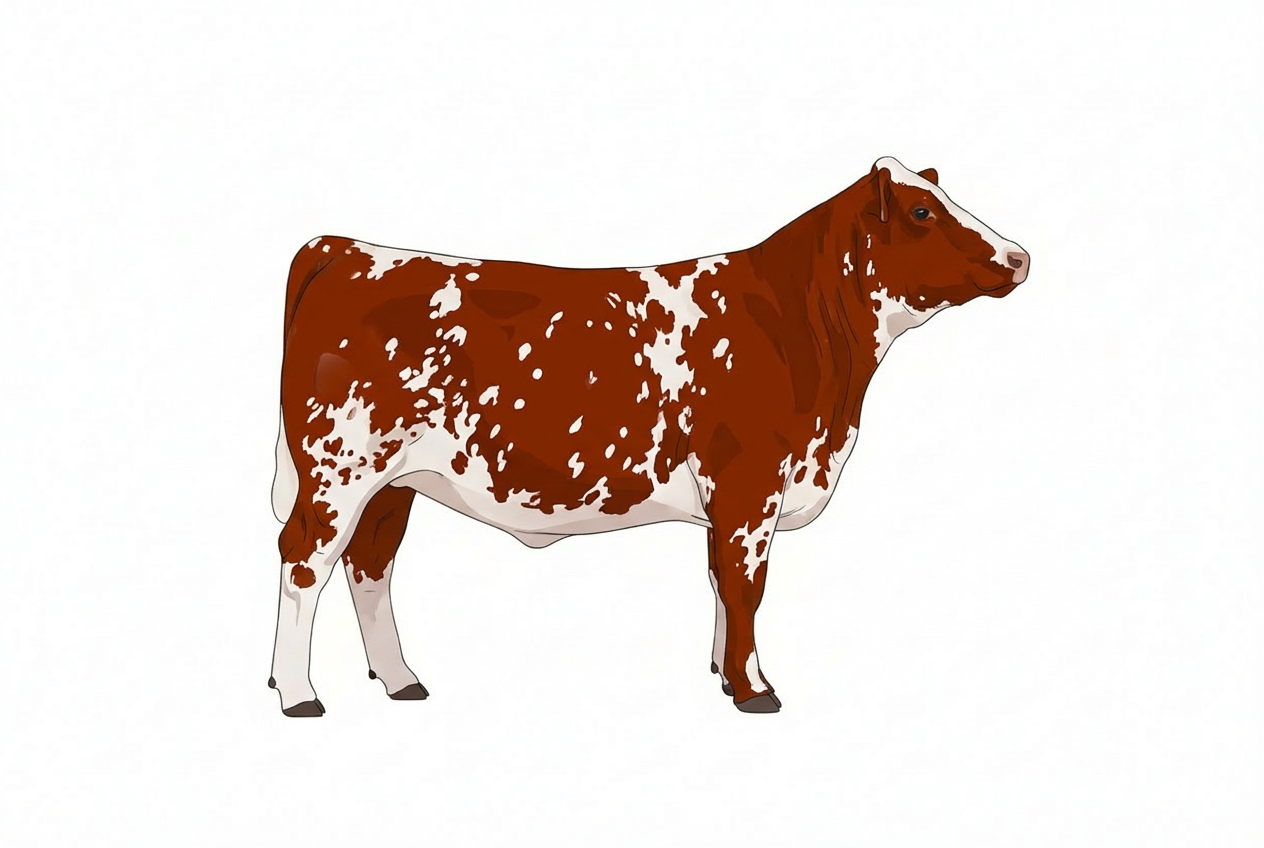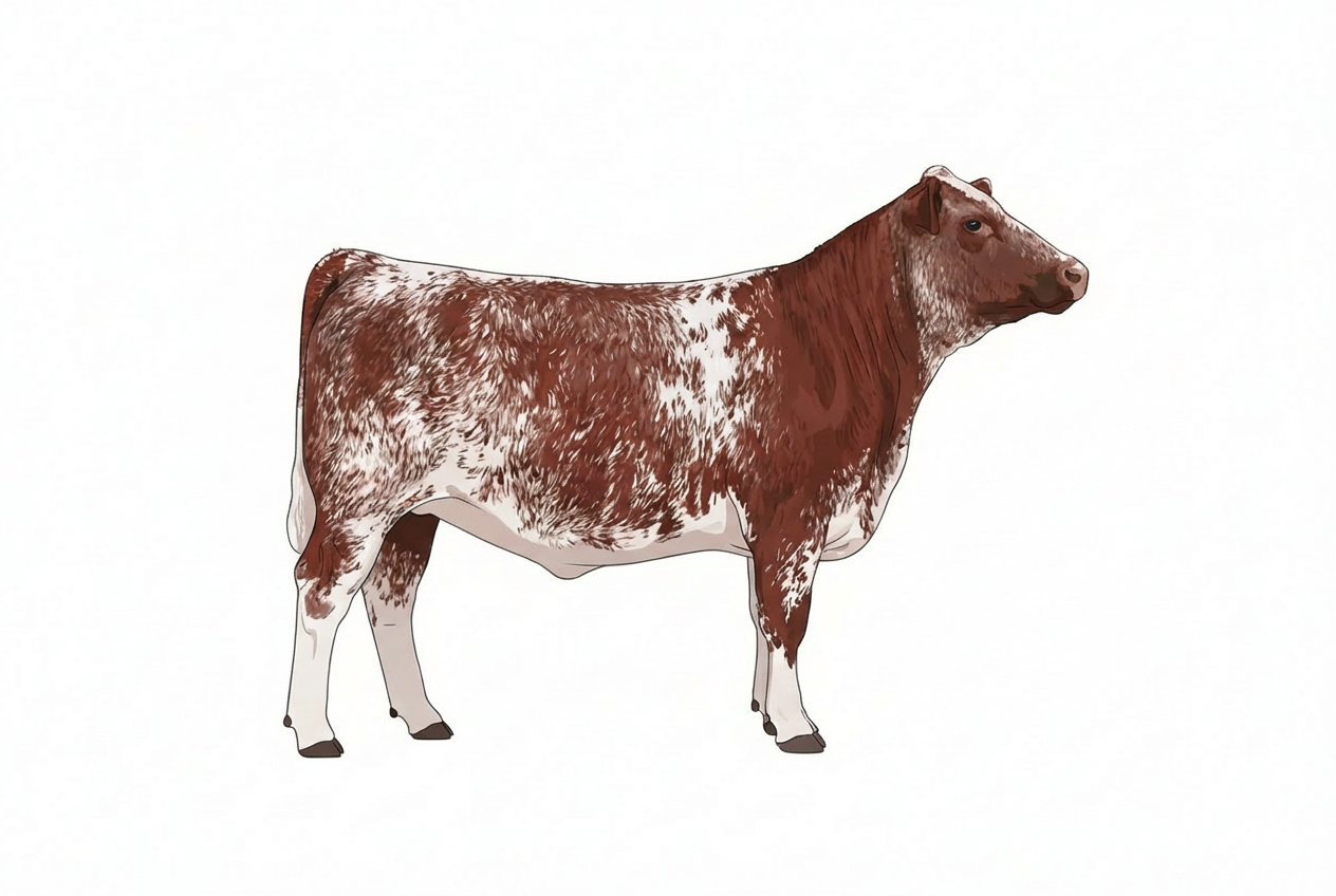 Cattle Color Images Added color image: Red white roan with minimal spotting with ticking Fullblood Shorthorn heifer (polled) View